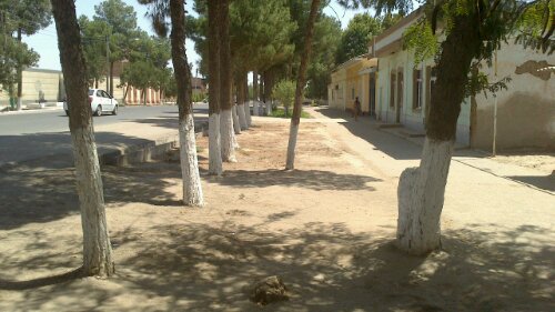 In der Mittagshitze tappte ich durch die Straßen im Süden der Stadt, in der vergeblichen Hoffnung auf einen Flußblick. Ein freundlicher Russe (Danke, Александр!) zeigte mir dann den Zoo, von dessen südlichen Ende aus man in einigen hundert Meter Entfernung den Amu-Darja erkennen kann. Den Hinweis „nicht photographieren“ vergaß auch er nicht. Anscheinend ist das ein so schlimmes Vergehen, daß man auf frischer Tat erschossen und anschließend an Ort und Stelle verhaftet wird, um eine saftige Geldstrafe zu zahlen, worauf man des Landes verwiesen wird und lebenslang Einreiseverbot erhält.