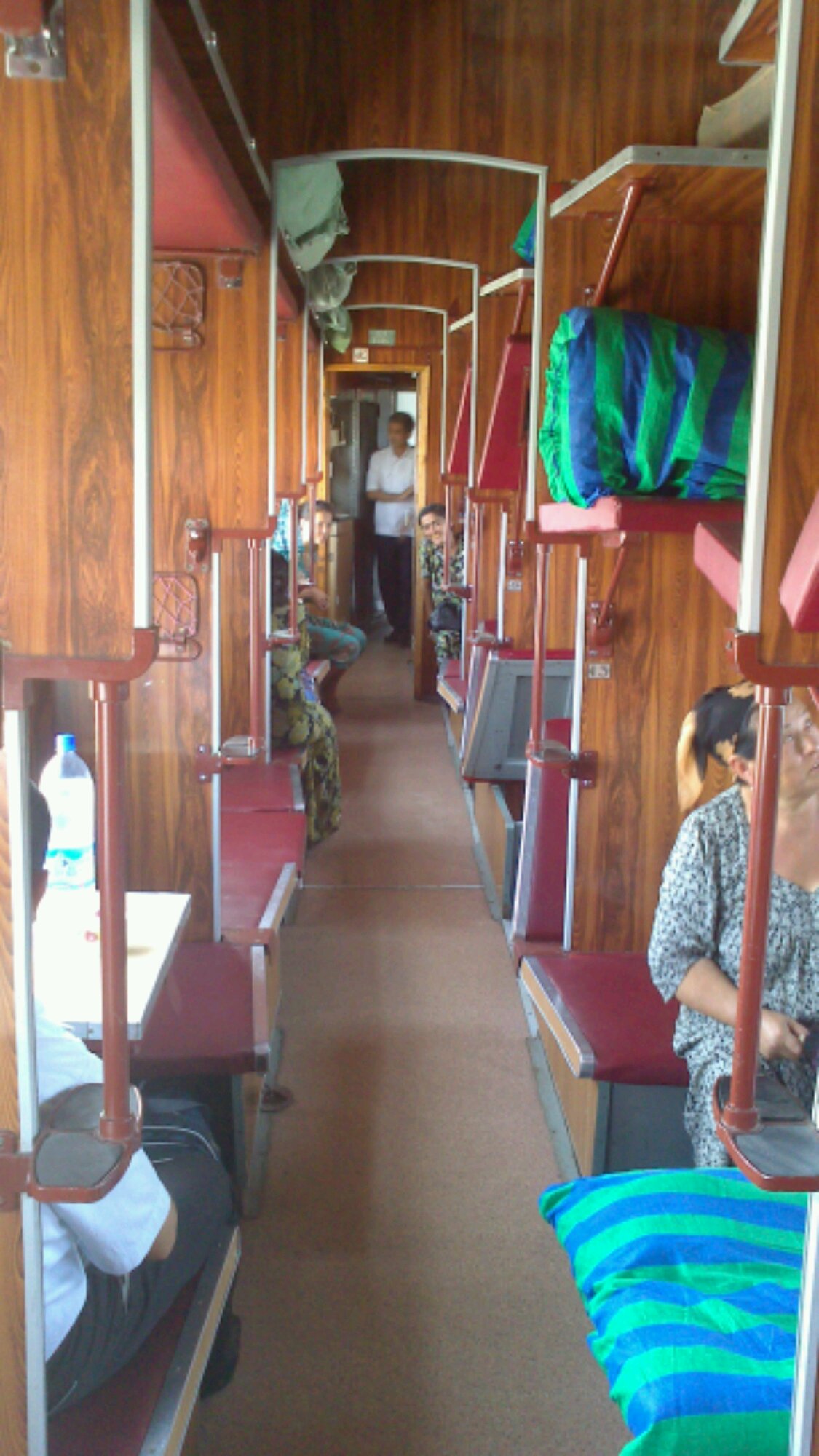 Der Zug über Qarshi, Samarkand nach Tashkent verkehrt an ungeraden Tagen. Die Liegewagen der 2. Klasse (es handelt sich um den sowjetischen Standardtyp 74) sind nicht klimatisiert, entsprechend heiß war es im am Nachmittag bereitgestellten Zug von rund 20 Wagen.